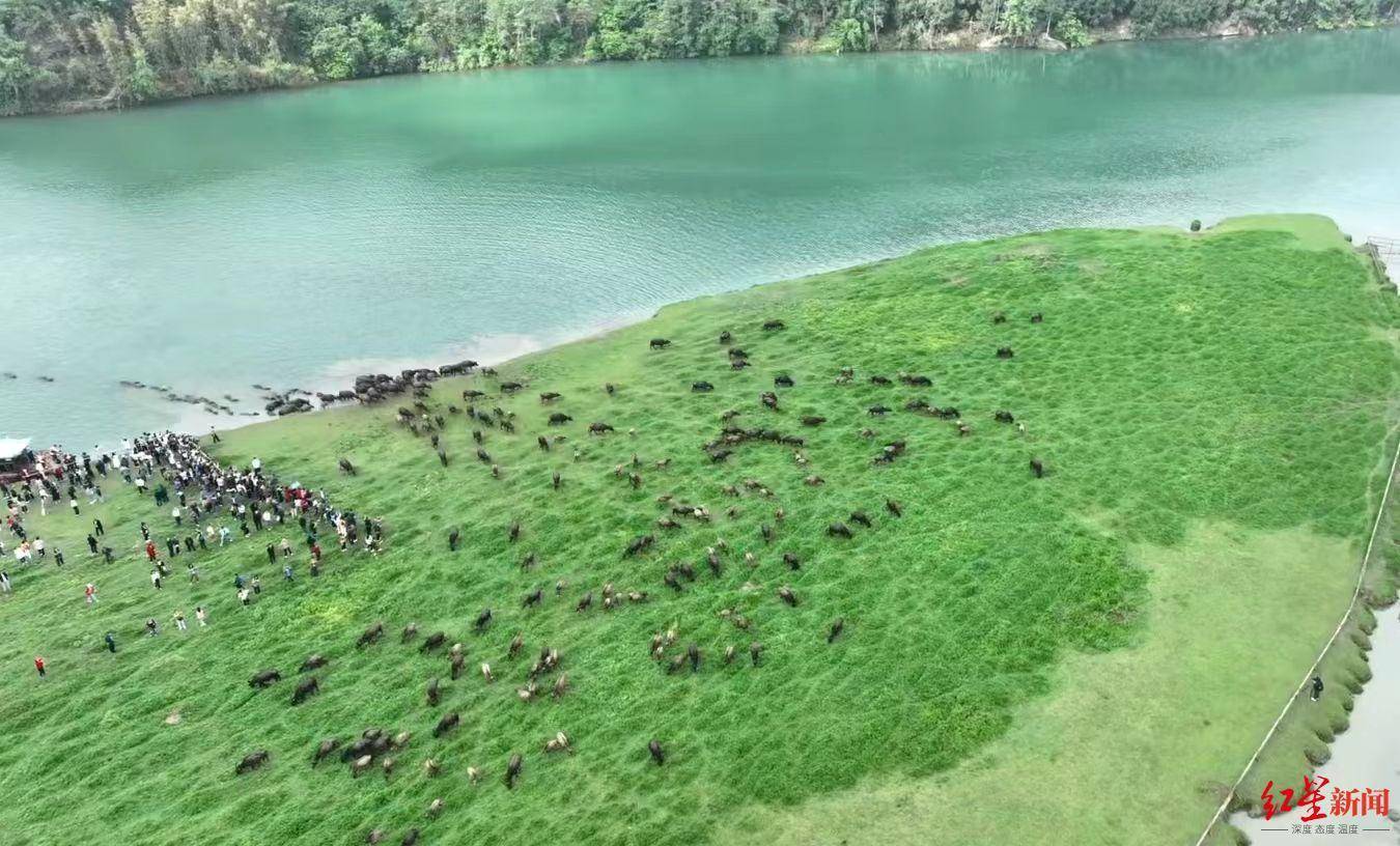 本日上昼9时20分许,跟着江边栅栏门的开启,早已等候在此的200余头群山万壑的水牛不甘人后冲向嘉陵江,死力向水草丰茂的江心太阳岛游去。在水光潋滟的江面,牛儿们每每变换队形,如同跳起了“水上芭蕾”。经由四五分钟的踏浪前行,它们登上太阳岛,启动快乐地啃食青草、追赶嬉戏。