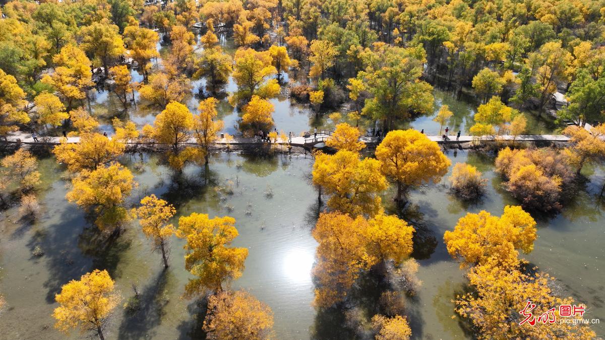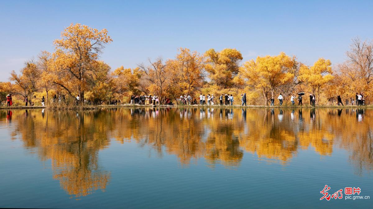 2025年10月2日,旅客在甘肃省酒泉市金塔沙漠胡杨林景区不雅赏胡杨林好意思景。(曹红祖摄/光明图片)