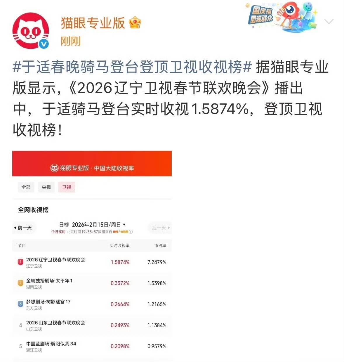 该范例以1.5874% 的及时收视率登顶卫视春晚榜首,联系话题#辽宁春晚 于适骑马出场#单日阅读量超千万。“鲜衣良马少年郎”“春晚骑马第一东说念主”等词条刷屏酬酢平台。