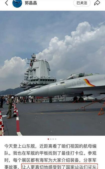 这且归参不雅山东舰,郭晶晶还在我方的酬酢账号上发了个动态,共享了我方的感受。