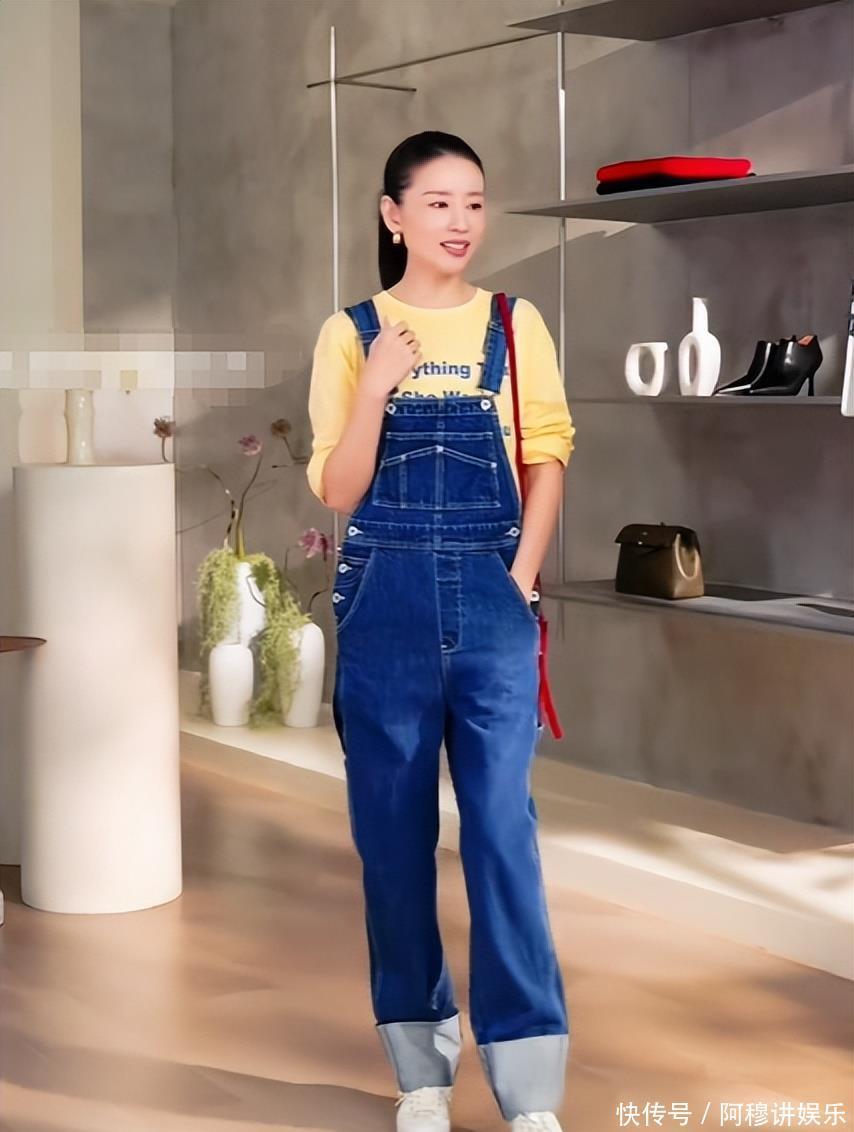 体格依旧是这样苗条,一件黄色的短袖搭配背带裤,看起来芳华飘溢,像是减了20岁,