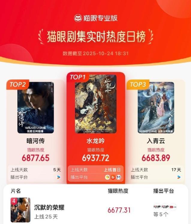 咱们可以看到,《暗河传》是在10月20日开播的,跟着剧情更新,这部剧的口碑似乎并莫得发酵,而10月24日,罗云熙主演的《水龙吟》开播,这部剧刚开播半个小时,就得胜登顶及时热度榜单,开播六个小时的期间,全网热度依然达到9754.78。