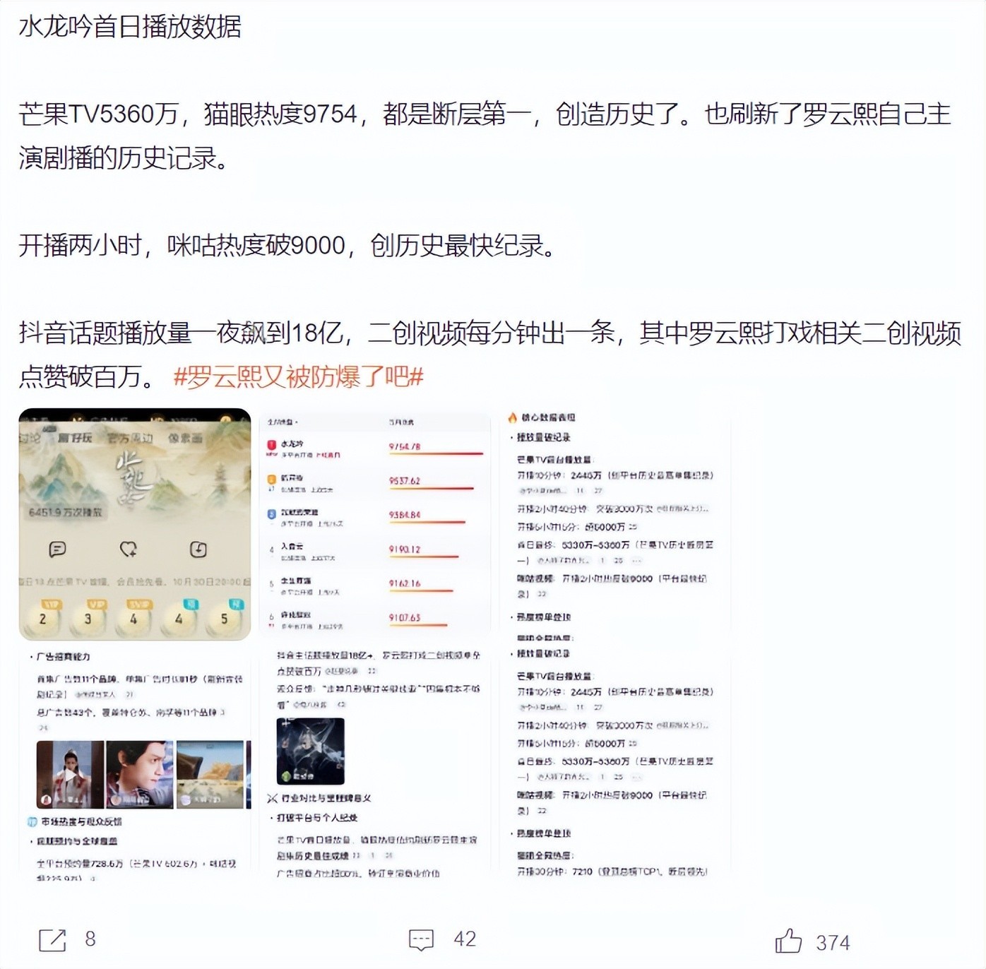 《水龙吟》开播后,罗云熙奏凯刷新我方主演剧播出的历史纪录,芒果TV5360万,猫眼热度9754,皆是断层第一,在这么的情况下,《暗河传》念念要脱颖而出,如实有些勤奋,但也有一定的可能。