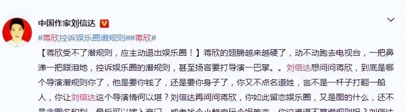 作者兼导演刘信达竟公开月旦蒋欣,宣称淌若无法罗致业内所谓的“试验章程”,就应当主动离开这个行业。