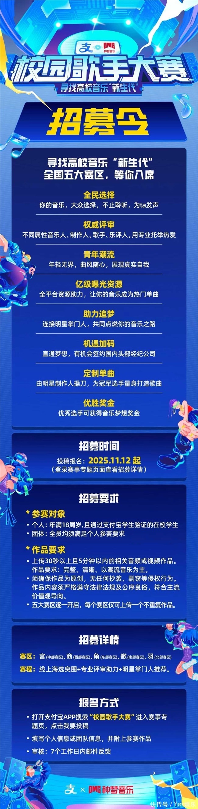 11月12日,由支付宝连结中国顶尖说唱公司种梦音乐D.M.G连合髻起的“校园歌手大赛”厚爱启动,并发布官宣海报招募令。一场校园共振的潮水音乐派对,一次集结世界高校花火的通达之旅,寻找高校音乐“更生代”,世界五大赛区,恭候你的加入,梦思即刻动身!