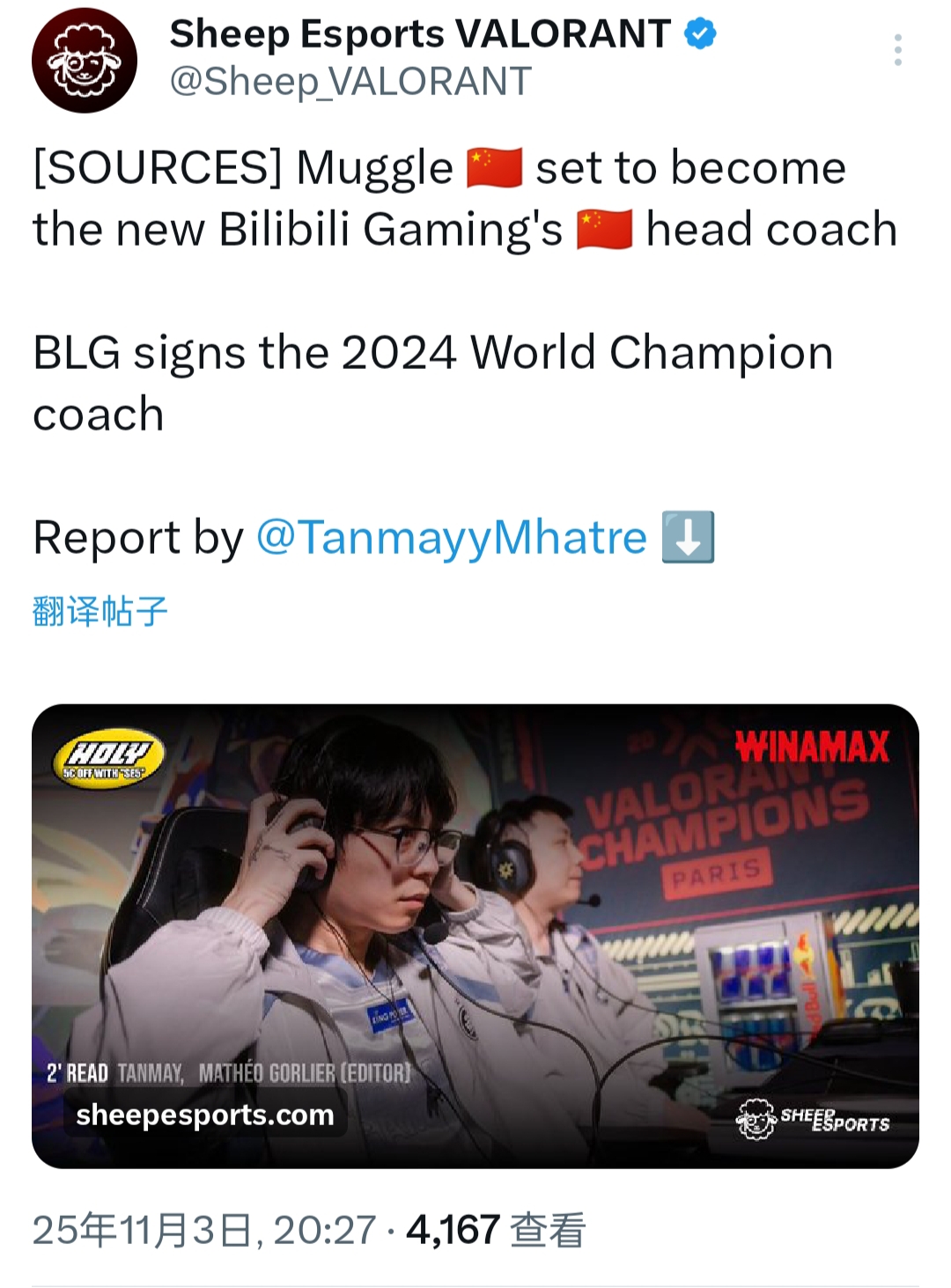 虎扑11月03日讯 外媒爆料:前EDG素质Muggle将加入BLG担任主素质。